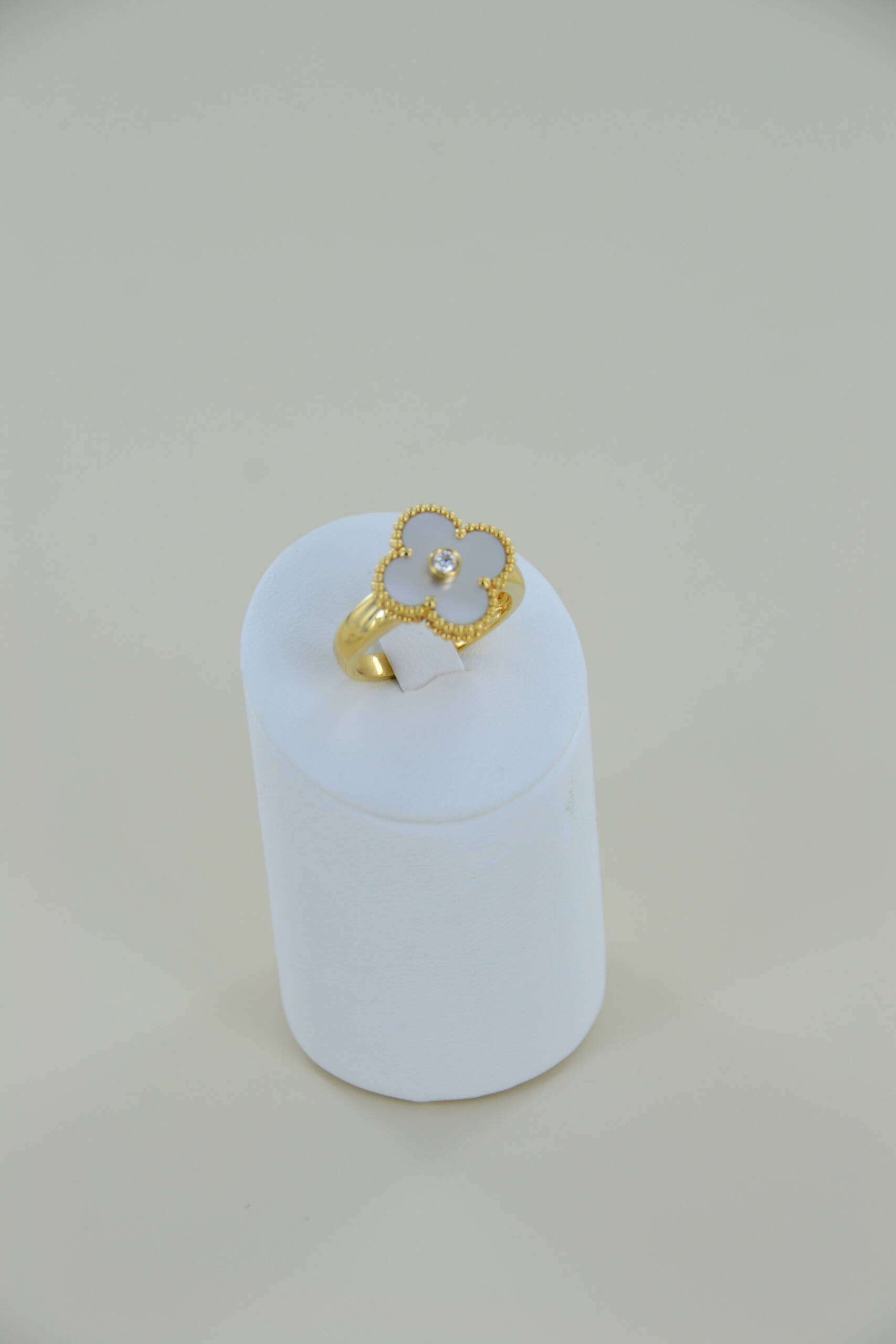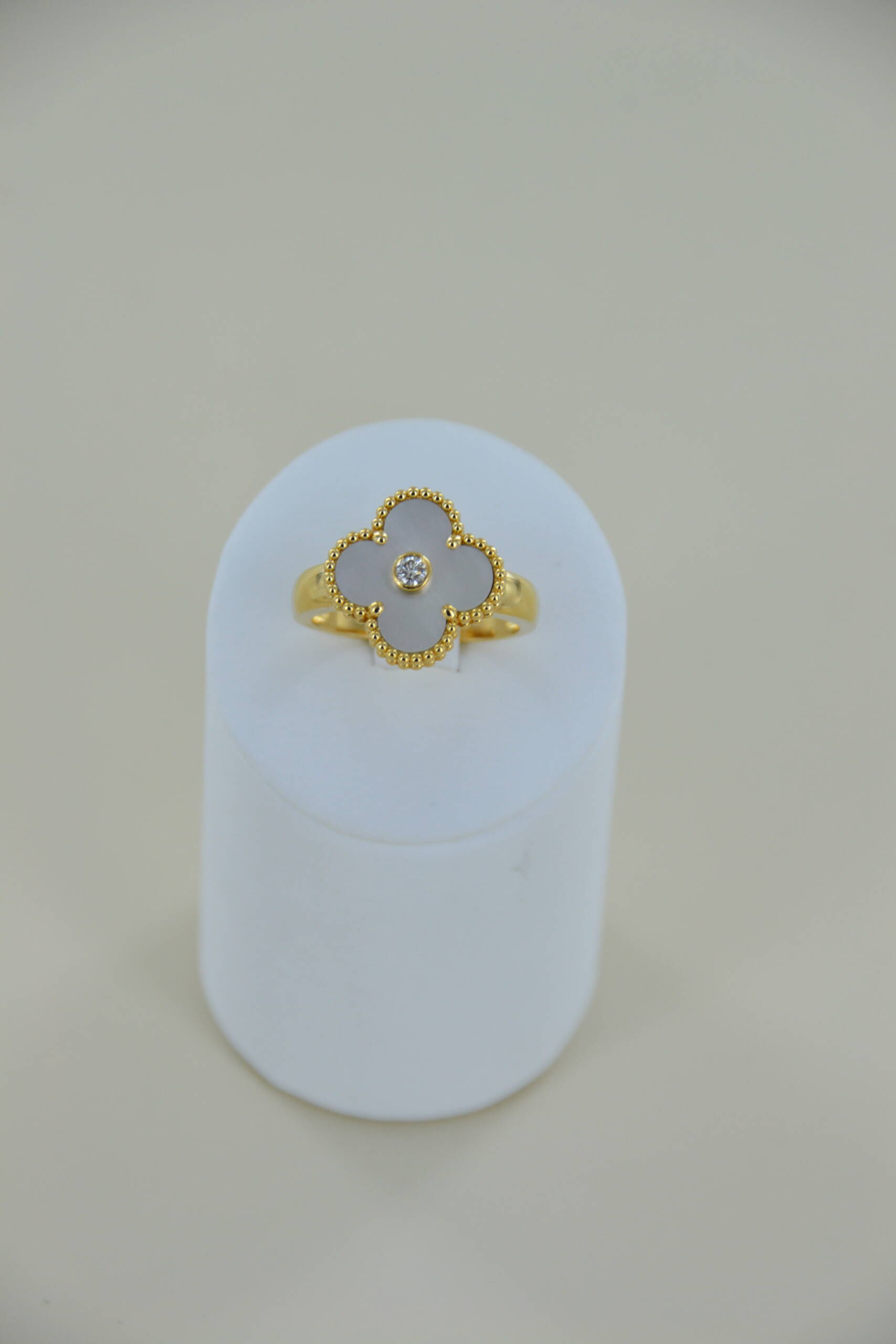 Bague Van Cleef Nacre blanche et diamant Vintage Alhambra Or jaune 750/1000. Diamant rond; qualité diamant E, VVS1. Sans papiers ni coffret.