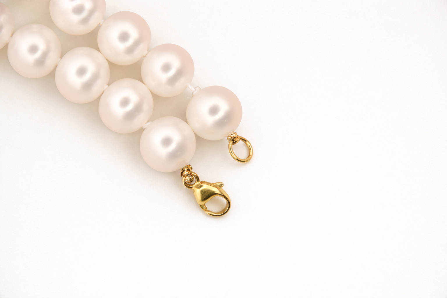 Bracelet 20 perles blanches 8.5-9.5 MM. Bracelet avec un nœud entre chaque perle. Mousqueton or 18 ct.